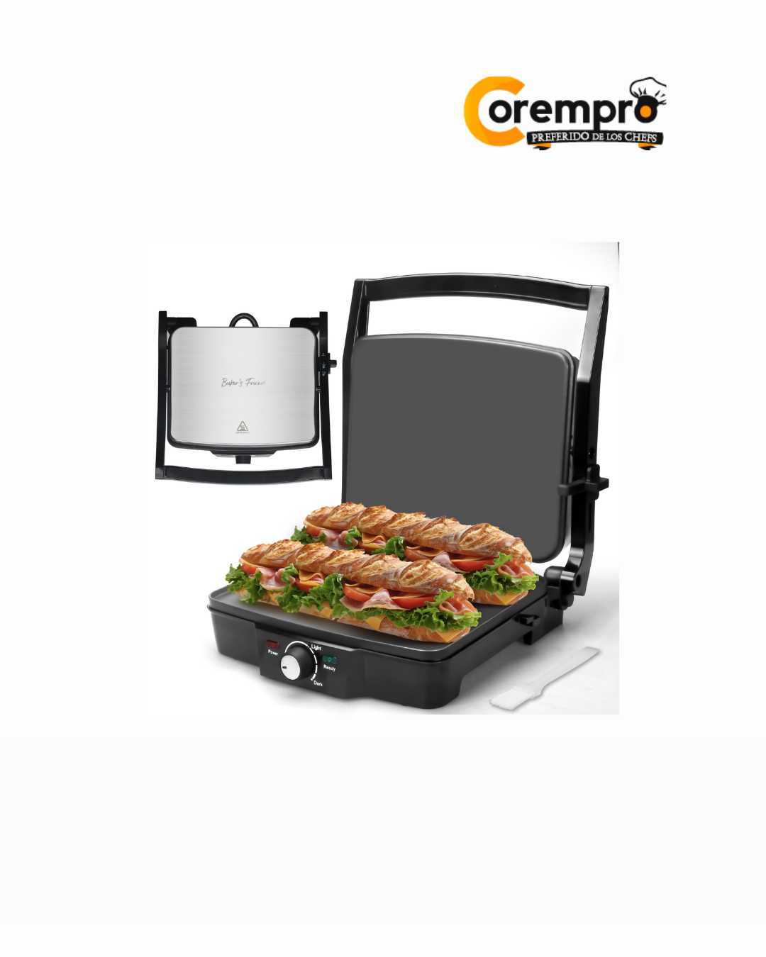 Etiquetas: electrodomésticos Baker's Friend, equipo cocina práctica, parrillera eléctrica pequeña, plancha de contacto panini, plancha para sándwiches gourmet, Prensa panini Baker's Friend, prensa para paninis acero, sandwichera eléctrica profesional, tostador de sándwiches antiadherente