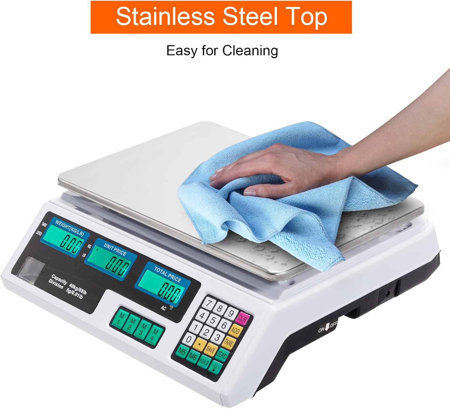 - Plataforma de pesaje impermeable: equipada con una parte superior de acero inoxidable impermeable, que es fácil de limpiar. Esta báscula comercial de alimentos es fácil de usar en un puesto de productos, mercado de carne, supermercados, tiendas de comestibles y otros puntos de venta.