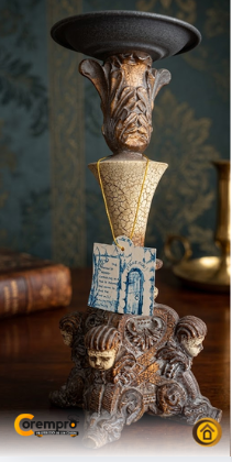 Dale un toque de misticismo y lujo a tus espacios con este candelabro artesanal. Su estructura combina tonos bronce, tierra y crema con sutiles destellos dorados. El plato superior es amplio y robusto, diseñado para sostener velas de pilar de gran tamaño con total seguridad. Es un accesorio decorativo con mucha personalidad, capaz de transformar una repisa sencilla en un rincón lleno de historia y distinción.