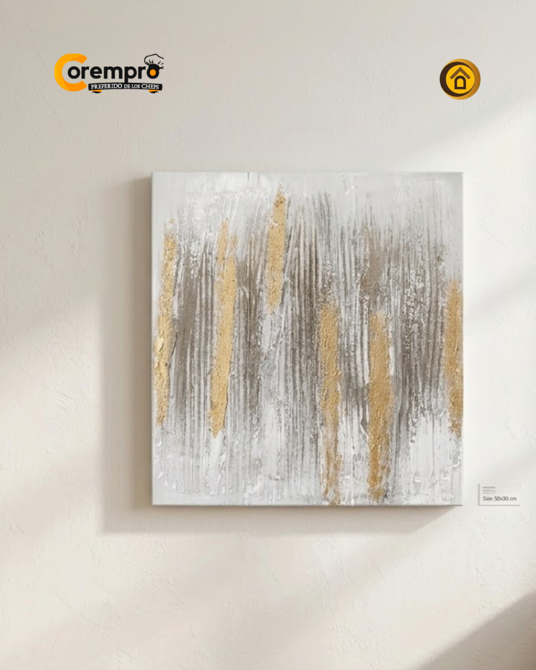 Esta obra es una pintura abstracta moderna que utiliza una técnica mixta con texturas en relieve y detalles en pan de oro sobre un fondo de tonos grises y blancos.
