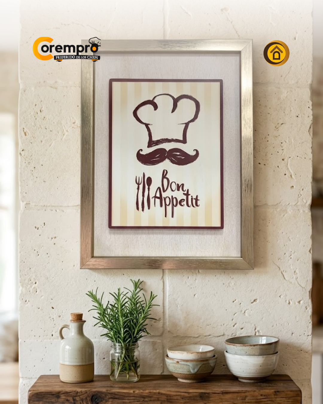 Eleva la decoración de tu hogar con este cuadro de cerámica de alta calidad. El diseño presenta un fondo de rayas tenues con iconos culinarios en contraste, enmarcado en un perfil minimalista de acabado metálico. Por su tamaño de 27 x 33 cm, es la pieza ideal para colocar sobre repisas de madera o colgar en paredes de acento, aportando un toque de personalidad sin saturar el espacio.