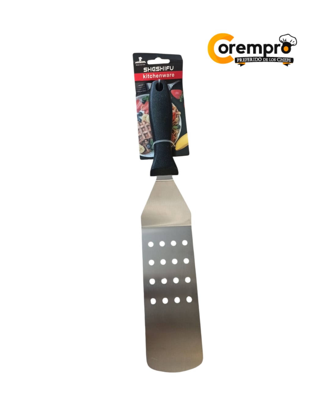 Esta espátula de cocina de la marca Sheshifu está fabricada con acero inoxidable y cuenta con un mango ergonómico plástico.Ideal para planchas , parrillas y sartenes para voltear alimentos sin dañarlos, de acero inoxidable