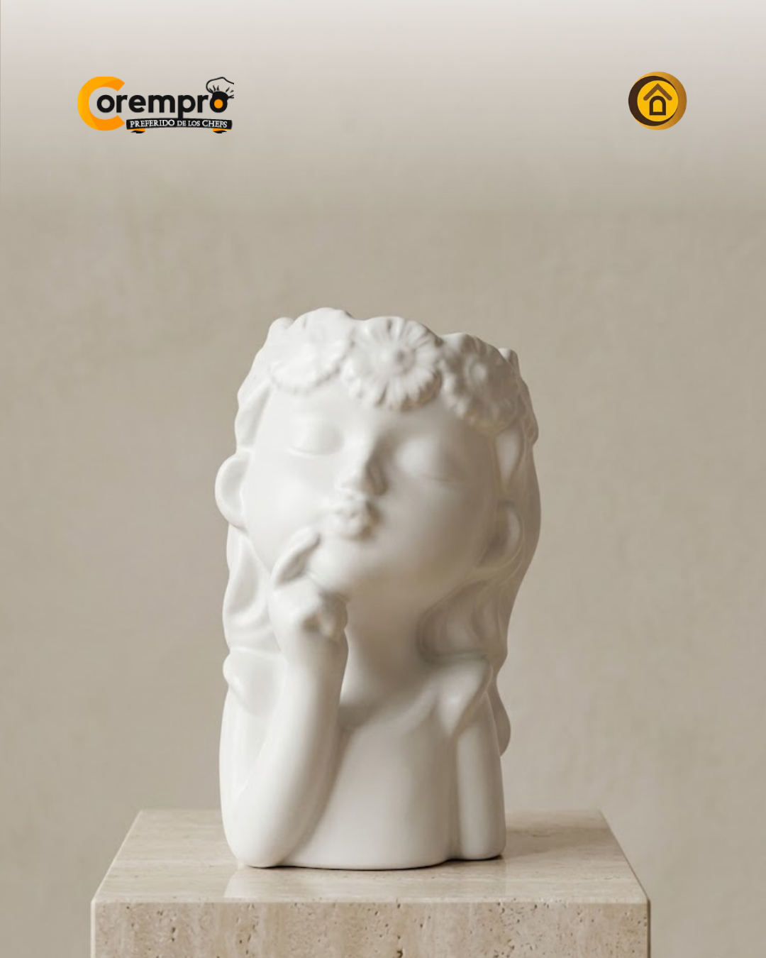 Añada un toque de serenidad y delicadeza a sus espacios con este exclusivo florero de cerámica. Con una altura de 22 cm, esta pieza captura la esencia de la feminidad en un gesto tierno y pensativo, coronado por una delicada diadema de flores. Su acabado en blanco puro mate es el lienzo perfecto para resaltar el color de sus flores favoritas o para lucir como una escultura independiente en su tocador, mesa de noche o estantería.