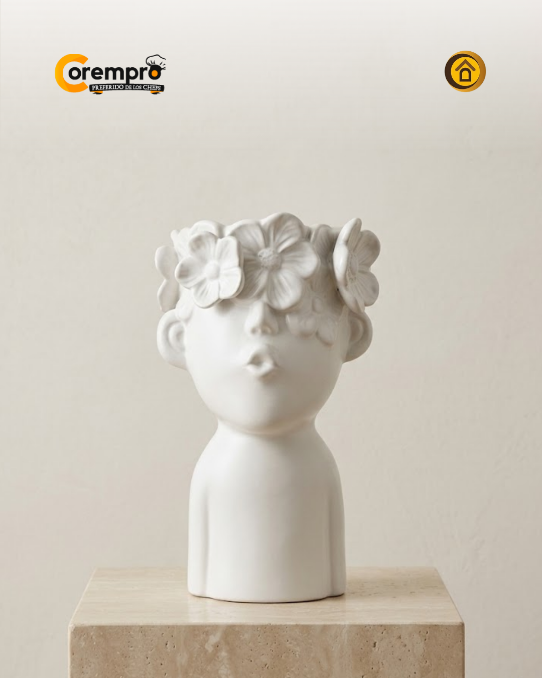 Redefina la elegancia de su hogar con este exclusivo florero de diseño vanguardista. Con una altura de 22 cm, esta pieza captura la serenidad de un rostro femenino coronado por una delicada diadema de flores, aportando un aire de romanticismo y paz a cualquier rincón. Su acabado monocromático es el lienzo perfecto para resaltar el color de sus flores frescas o secas favoritas, o simplemente para lucir como una escultura independiente en su tocador, mesa de noche o estantería.