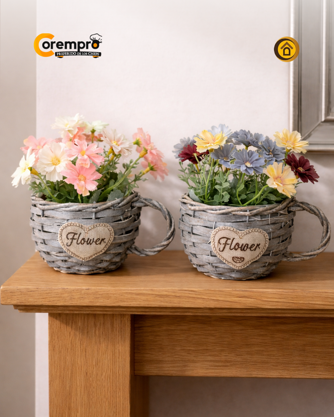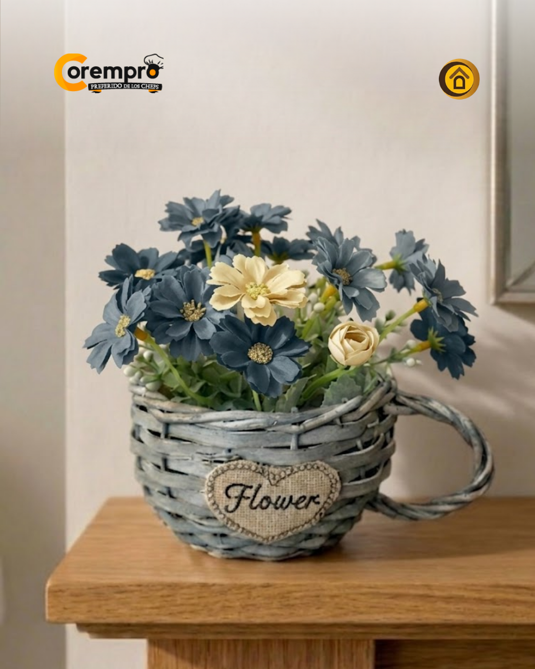Este conjunto decorativo presenta una selección de flores cuidadosamente dispuestas dentro de una canasta de diseño artesanal. La combinación de los pétalos vibrantes con el material tejido de la base crea un contraste de texturas que evoca la serenidad del campo. Es una pieza diseñada para capturar la luz y añadir suavidad a la decoración, funcionando como un punto focal acogedor que no requiere los cuidados de un jardín real.