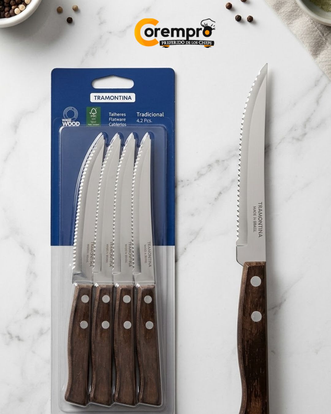 • Juego de Cuchillos de Acero Inoxidable y Mangos de Madera Tramontina 12 Piezas