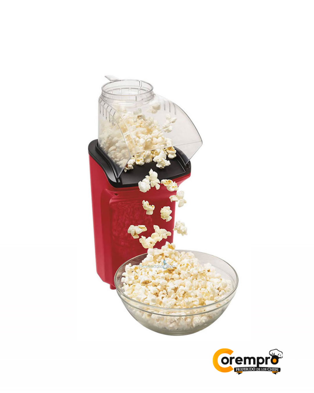 Esta máquina utiliza tecnología de aire caliente para preparar hasta 4.3 litros de palomitas sin necesidad de aceite. Su diseño inteligente permite que caigan directamente en tu recipiente, facilitando el servicio y la limpieza. Además, incluye una práctica taza dosificadora que también sirve para derretir mantequilla mientras la máquina trabaja.