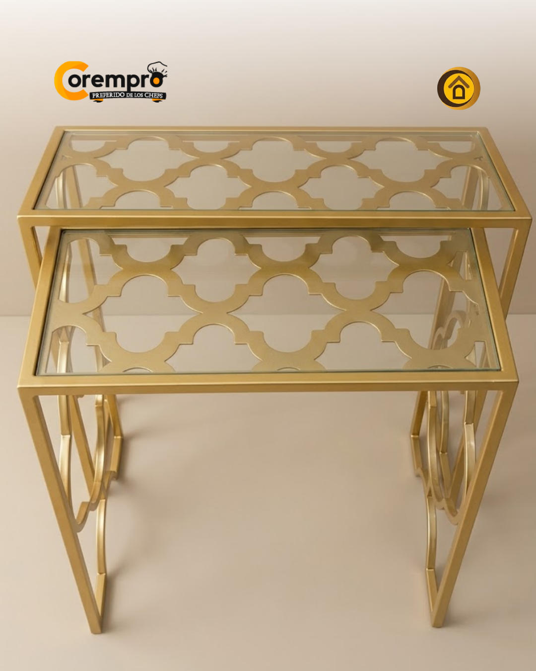 Transforme sus espacios con este set de mesas nido que son puro arte funcional. Su estructura dorada destaca por un exquisito diseño calado de inspiración árabe bajo el cristal, creando un juego de sombras y reflejos que cautiva a primera vista. Gracias a su formato encajable, son la solución perfecta para optimizar el espacio: úselas juntas para una superficie amplia y dinámica, o sepárelas como elegantes mesas laterales cuando reciba invitados.