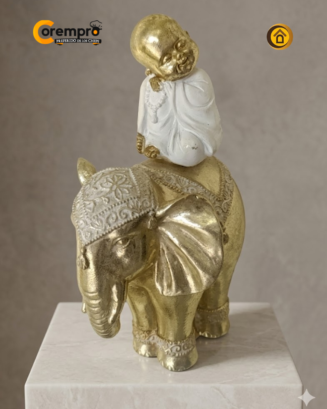 Incorpore un símbolo de paz y prosperidad a sus espacios con esta detallada figura de un monje hindú cabalgando un elefante de gala. Esta pieza de poliresina captura la esencia de la serenidad espiritual, donde el elefante representa la fuerza y la protección, mientras que el monje simboliza la búsqueda de la iluminación. Es el amuleto perfecto para crear un rincón de meditación o para atraer energías positivas en la entrada de su casa u oficina.