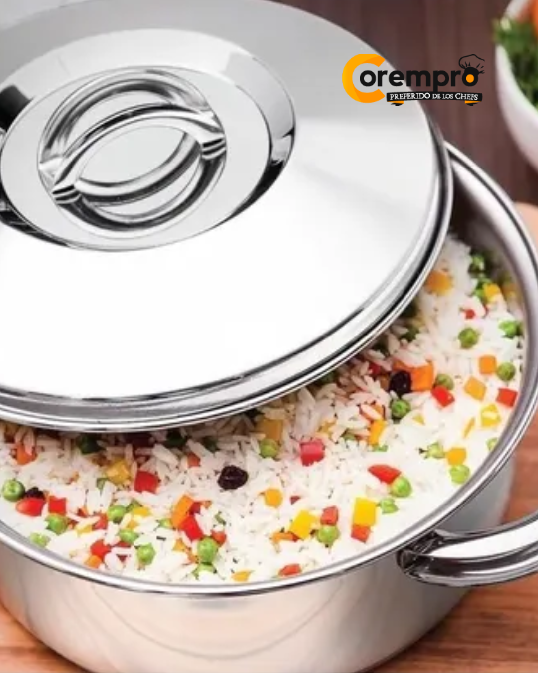 Lleva tu cocina al siguiente nivel con esta olla alta de acero inoxidable de grado premium. Con una capacidad de 15.2 litros (16 qt) y un diámetro de 30 cm, es la herramienta definitiva para preparar caldos, pastas y guisos de gran volumen. Su característica estrella es el triple fondo (acero inoxidable + aluminio + acero inoxidable), que distribuye el calor de manera uniforme, eliminando puntos calientes y permitiendo una cocción más rápida y eficiente en cualquier tipo de estufa, incluida la de inducción.