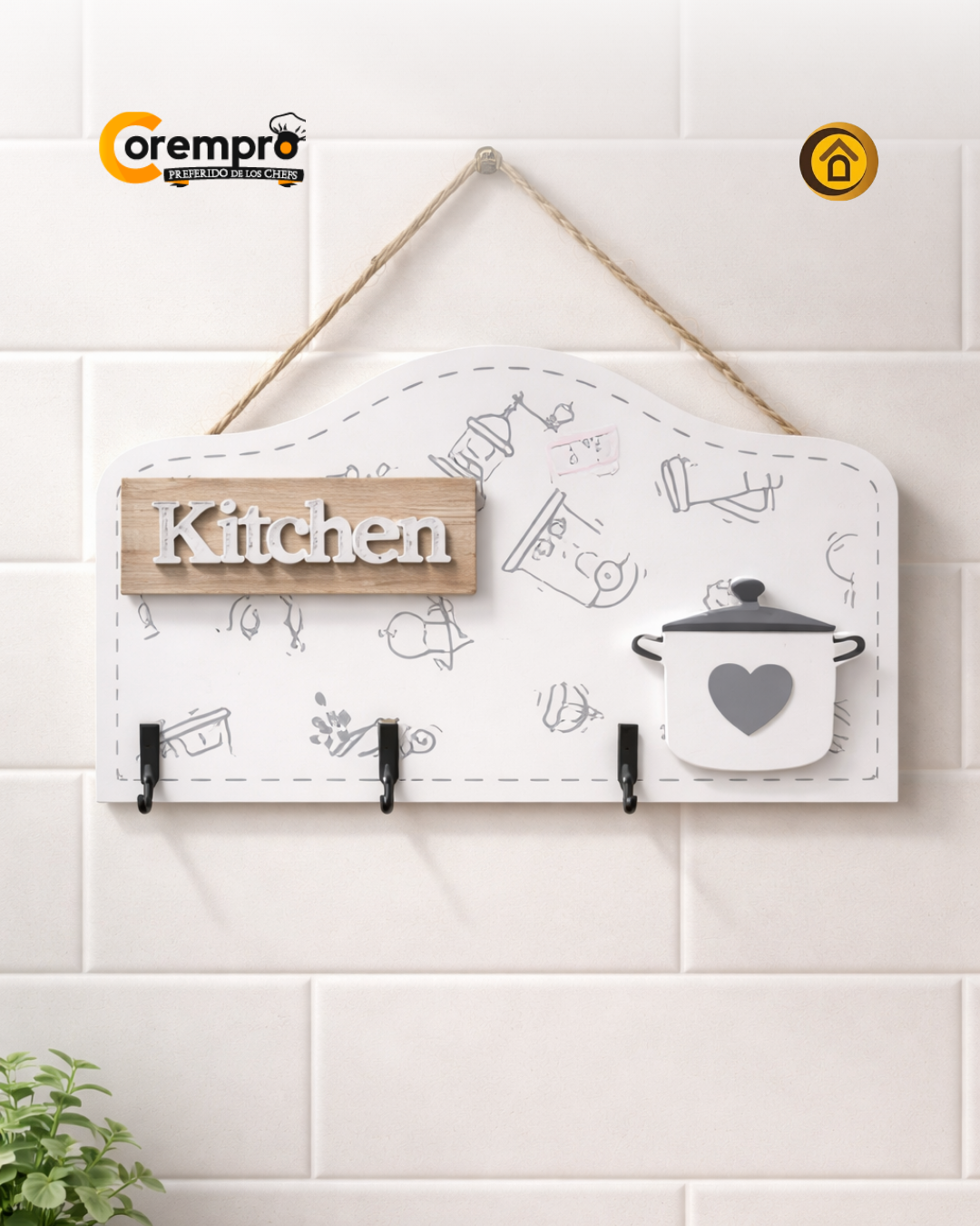 Dale un toque de orden y calidez a tu cocina con este portallaves decorativo. Con un diseño de fondo blanco adornado con sutiles ilustraciones culinarias, destaca por su placa de madera natural con la palabra «Kitchen» en relieve y un adorable detalle de olla con corazón. Sus tres ganchos resistentes son perfectos para mantener tus llaves, paños de cocina o delantales siempre a mano y organizados.