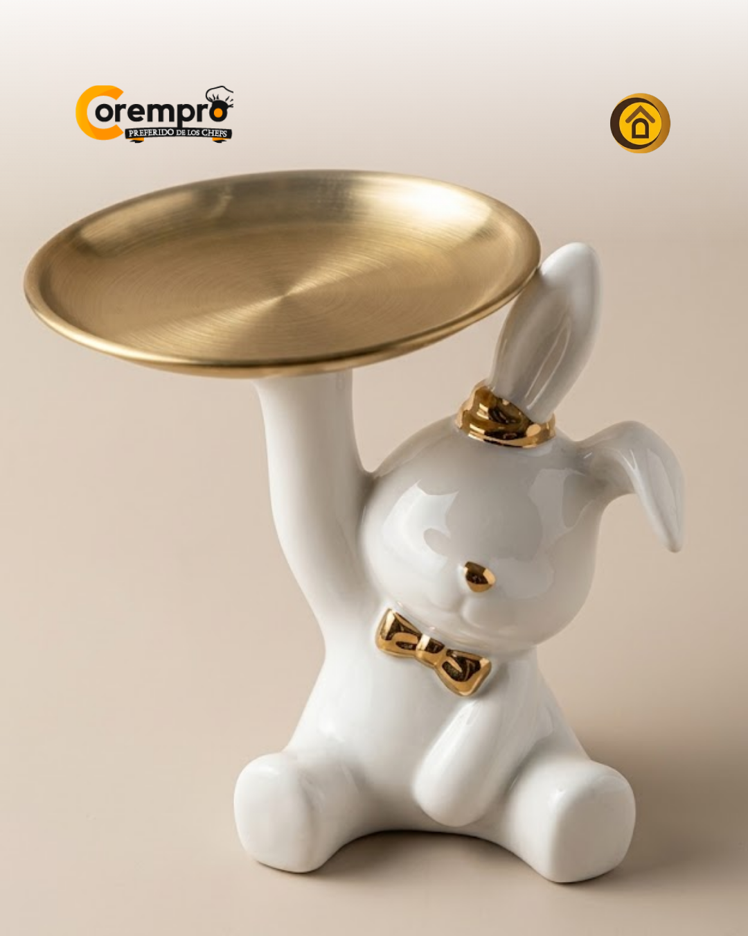 Transforma la organización de tus espacios con este adorno de conejo moderno. Fabricado en cerámica de alta calidad con un acabado brillante, esta pieza destaca por su pose dinámica y sus detalles metalizados. La bandeja superior ofrece el espacio justo para exhibir tus perfumes favoritos o guardar tus anillos al final del día.