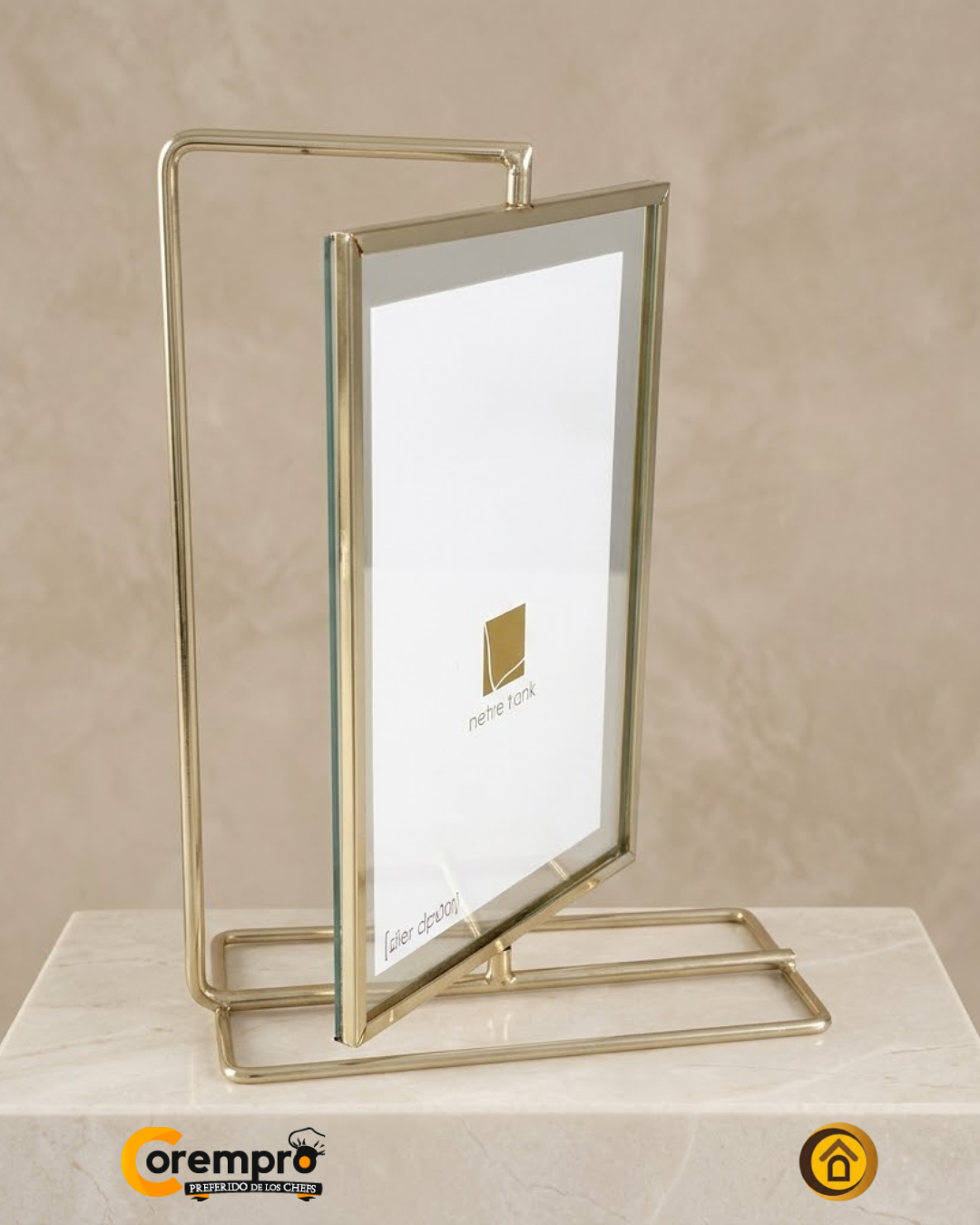 Etiquetas: decoración minimalista oro, marco de foto 5x7, marco de fotos moderno, marco metálico 5x7, portarretrato doble cara, Portarretrato dorado, portarretrato giratorio