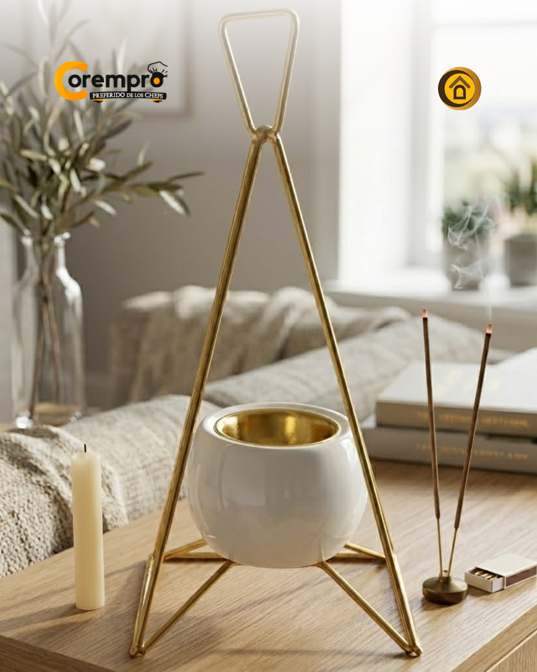 Eleva la energía de tus espacios con este Porta Vela e Incienso de Diseño Geométrico. Su estructura de metal dorado en forma triangular sostiene un cuenco de cerámica blanca esmaltada con un interior dorado reflectante, creando un juego de luces cálido y sofisticado. Es la pieza perfecta para rituales de meditación, aromaterapia o simplemente como un acento decorativo de lujo en tu sala u oficina.