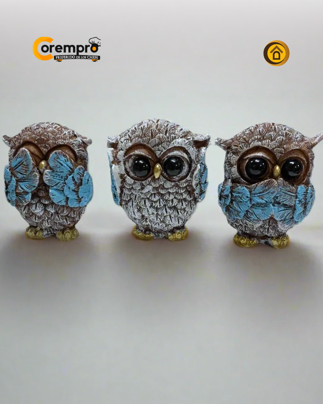 Embellece tu hogar con este encantador trío de búhos decorativos, representantes de la milenaria filosofía de la sabiduría: no ver el mal, no oír el mal y no decir el mal. Cada figura ha sido cuidadosamente esculpida con una textura que imita el plumaje natural en tonos tierra y nieve, resaltados con sutiles toques de color celeste en sus alas. Estos pequeños guardianes no solo son un detalle decorativo, sino un recordatorio constante de paz mental y reflexión para tu oficina, sala o estudio.