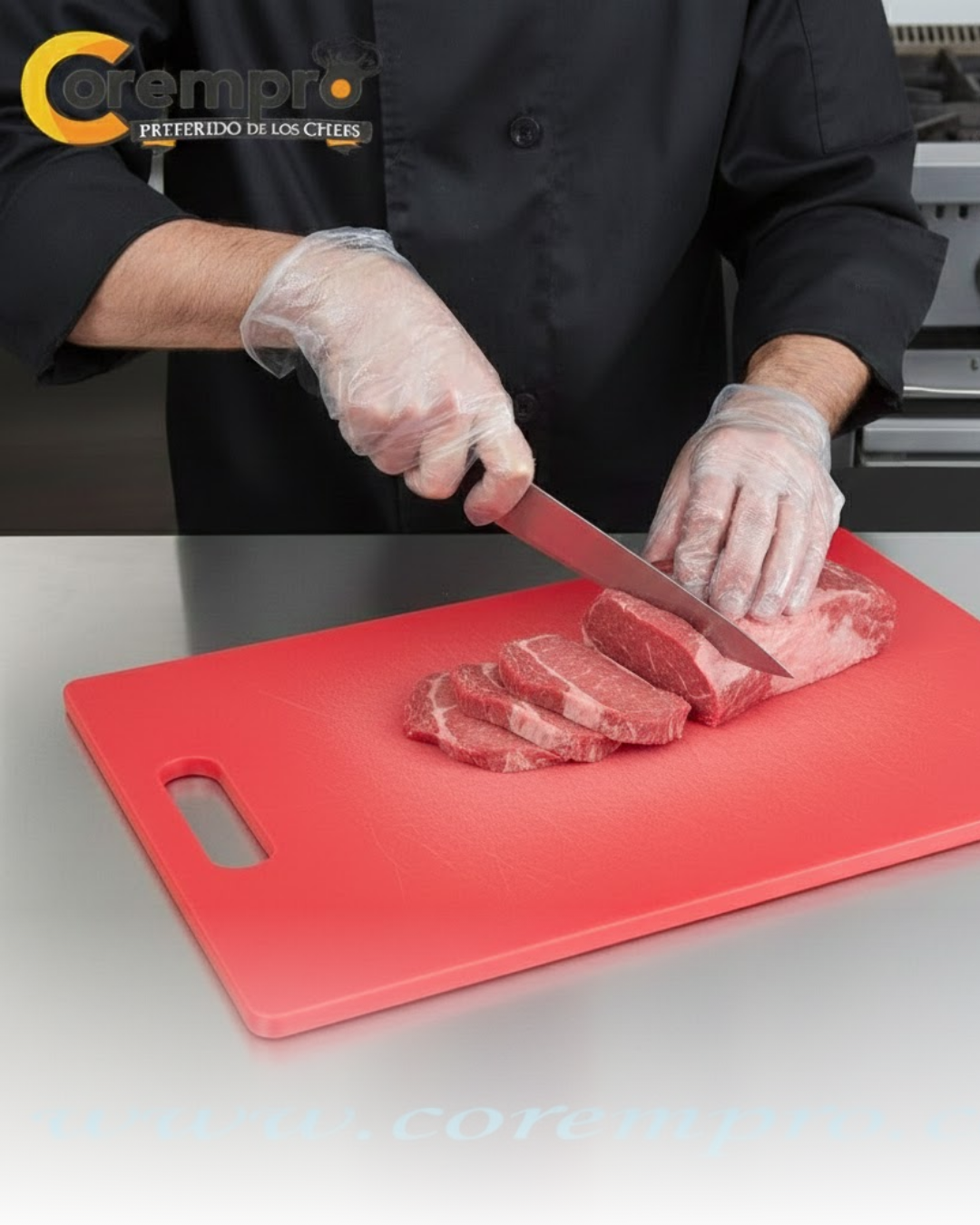 Siguiendo un sistema codificado por colores, esta tabla de cortar roja sirve para carnes rojas crudas (ternera, res, cerdo, cordero, caza). ¡Puede invertir en alfombras de corte (se venden por separado) para colocarlas debajo de su tabla para evitar resbalones y lesiones! ¡Comience a practicar métodos seguros de preparación de alimentos hoy!