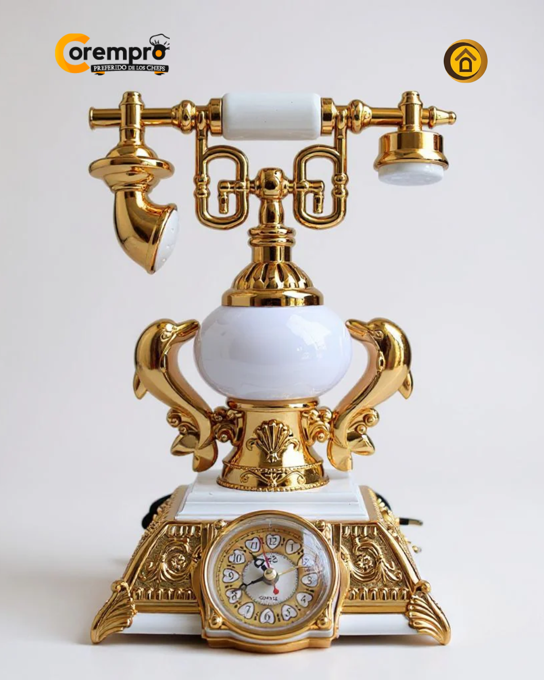Viaje en el tiempo con esta pieza única que fusiona el diseño clásico de un teléfono de los años 20 con las comodidades modernas. Esta estación de mesa decorativa no solo evoca la nostalgia de las conversaciones telefónicas de época con su auricular de acabado bronce y cable trenzado, sino que también integra un funcional reloj analógico con números romanos y una práctica lámpara para iluminar sus lecturas.